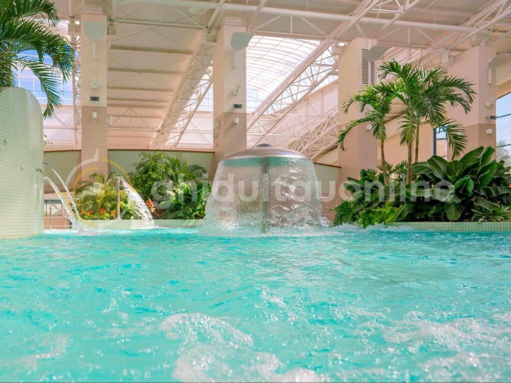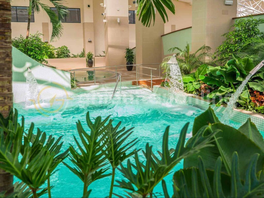 Cat pentru partea de destindere, hotelul dispune de un Aqua Park cu numeroase facilitati: 10 piscine in aer liber (apa termala, hidromasaj, relaxare, pentru copii, jacuzzi, aventura), 2 tobogane, loc de joaca, 4 piscine exterioare si teren de volei.
