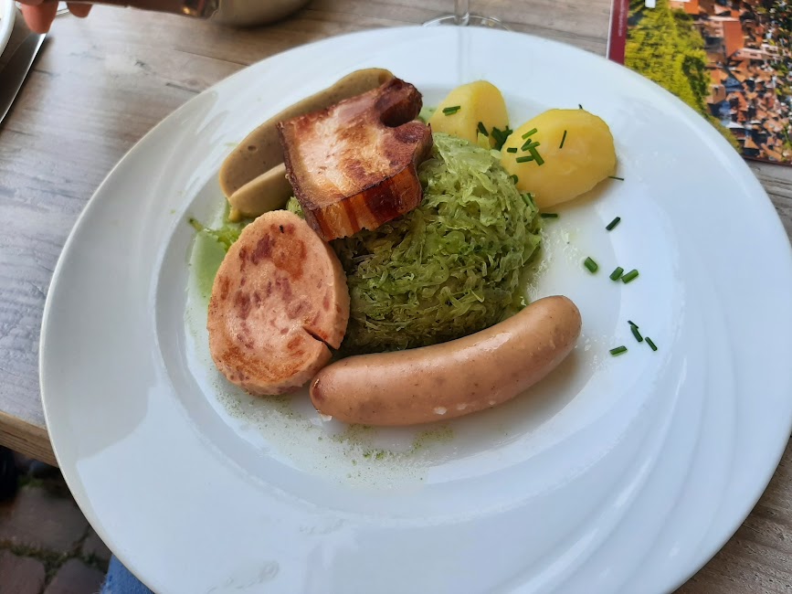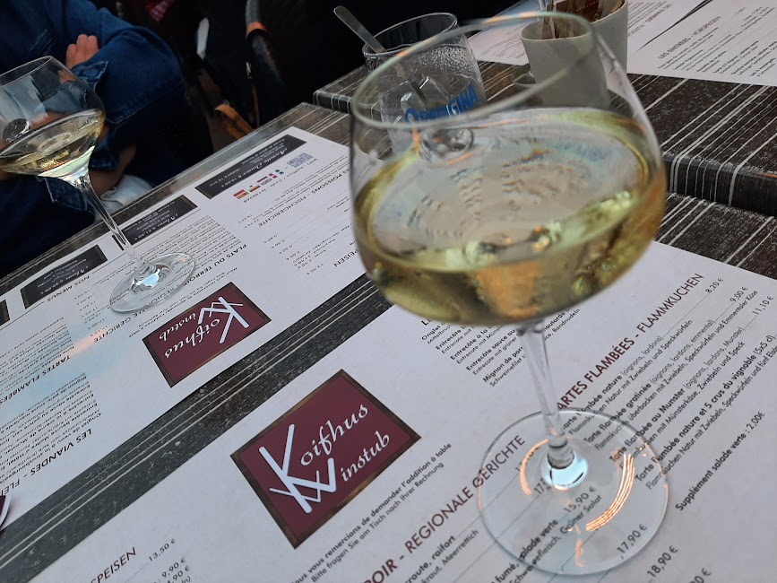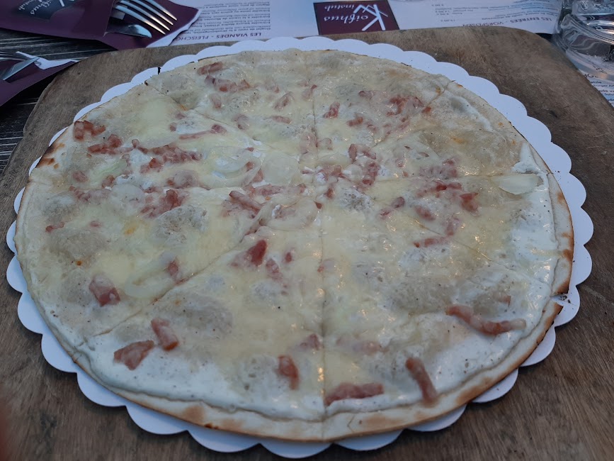 Dupa ce i-am descoperit o parte din farmec, ne-am asezat la o terasa, fiind lihniti de foame. Ne-am delectat cu traditionalele “tarte flambee” - o pizza cu blat subtire, cu branza, bacon, ceapa si cartofi gratinanti si ceafa afumata. Toate insotite de un delicious pahar de vin Riesling. (8-10 euro tarta, 17 euro portia de mancare cu carne, 3-3.5 euro un pahar de 125 ml vin).