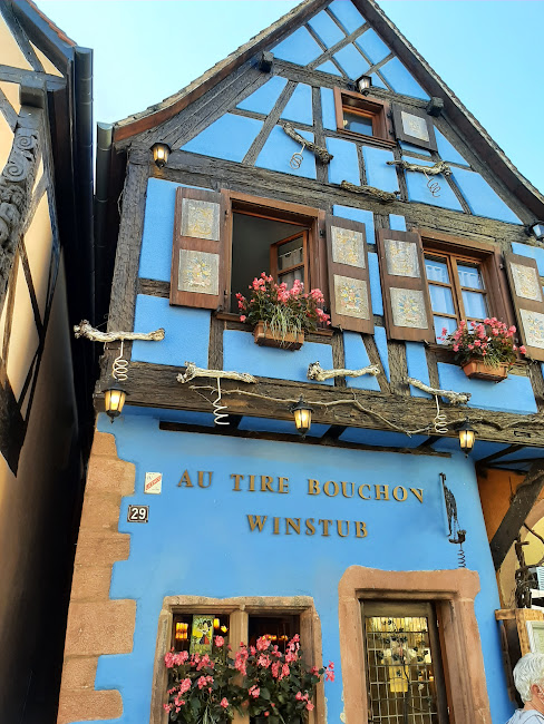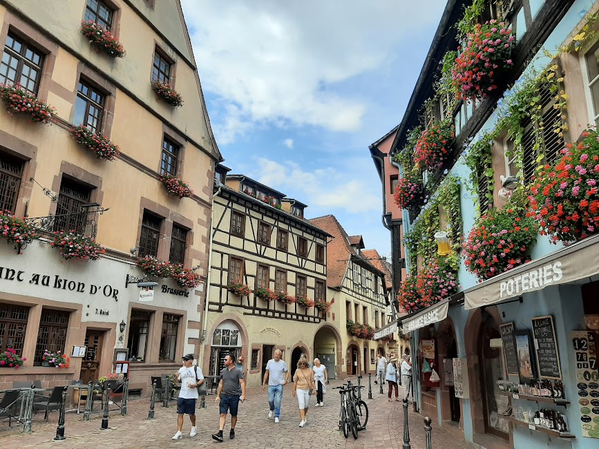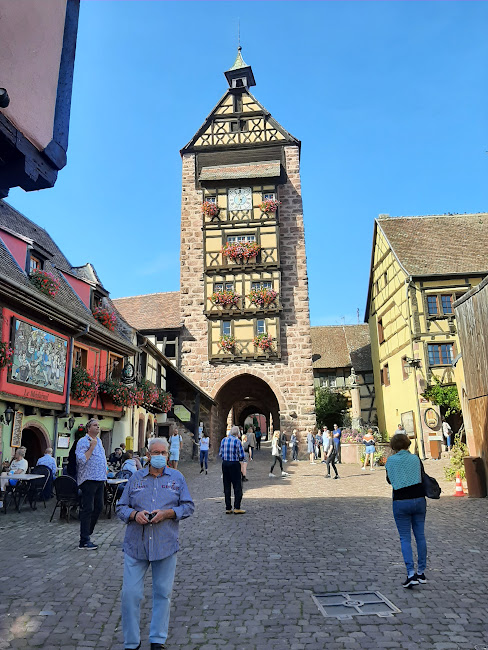 Dupa o ora jumate, ne-am imbracat din nou in buburuza noastra si ne-am indreptat spre Riquewihr, cel mai frumos si colorat oras al Alsaciei. Am intrat prin poarta orasului, pe strada centrala Rue du General si am admirat frumusetile care ne inconjurau (case cu flori colorate, magazine artizanele care comercializau produse traditionale: nenumarate sortimente de branzeturi, salamuri, fursecuri, covrigi, etc.). Aici aveam inclusa masa de pranz intr-o alta locatie specifica, minunata de altfel. Am mancat un preparat tipic alsacian Choucroute d’alsace (varza calita, cartofi fierti cu carnati, jambon, carne afumata) si un desert tarte aux pommes (tarta cu mere), totul insotit de un pahar de vin alsacian .