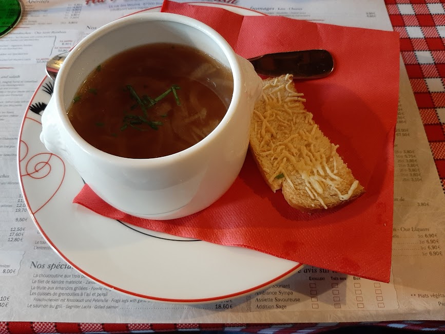 Intrucat incepuse o rafala puternica de ploaie ne-am adapostit intr-un cochet restaurant de pe malul raului, St. Martin. Am mancat o delicioasa soupe a l’ oignon (supa de ceapa), o salata cu somon fume, un mix gril cu cartofi si o crème brulee, totul insotit, cum altfel de un vin rosu sec.