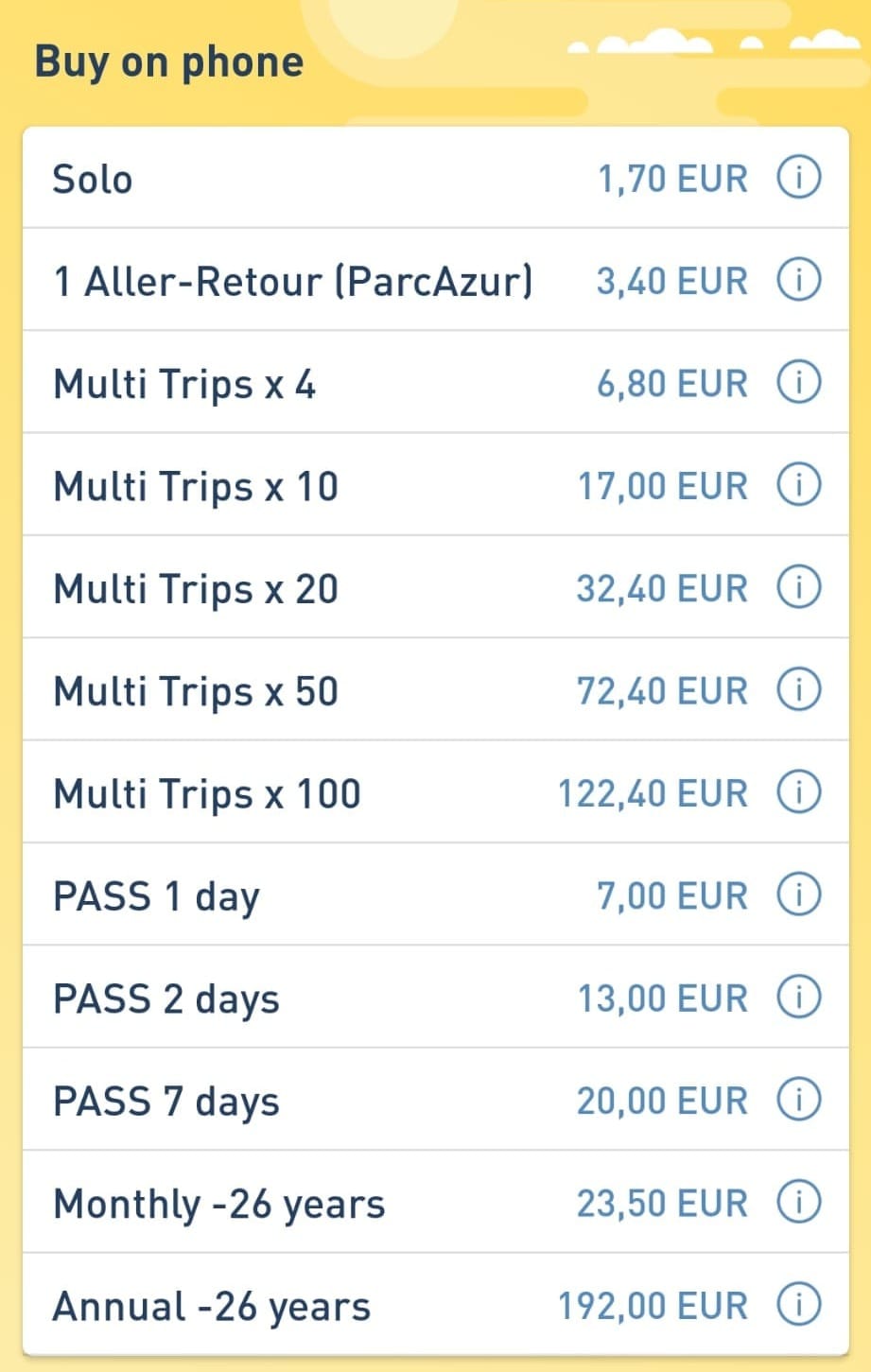 Pentru achiziționarea biletelor de tramvai/autobuz, va trebui să îți instalezi pe telefon aplicațiile Carte Lignes d`Azur și Lignes d`Azur Tickets.