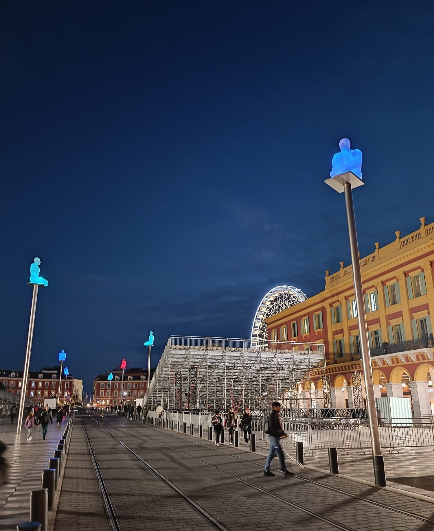 Tot aici, în Piața Massena, veți observa niște stâlpi înalți care au în vârf niște statui. Pe timpul zilei acestea se văd albe-crem, însă pe timpul nopții se aprind, fiecare având câte o culoare diferită.