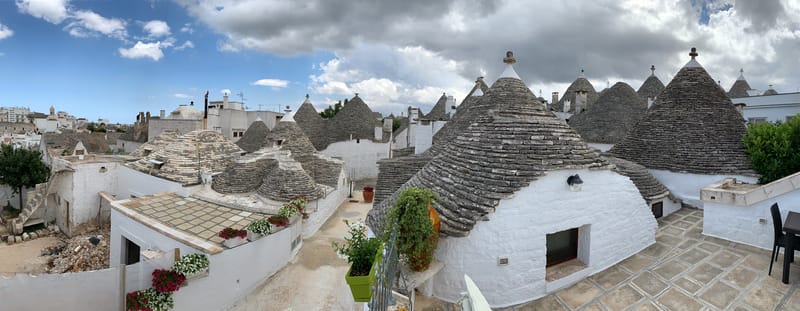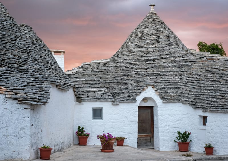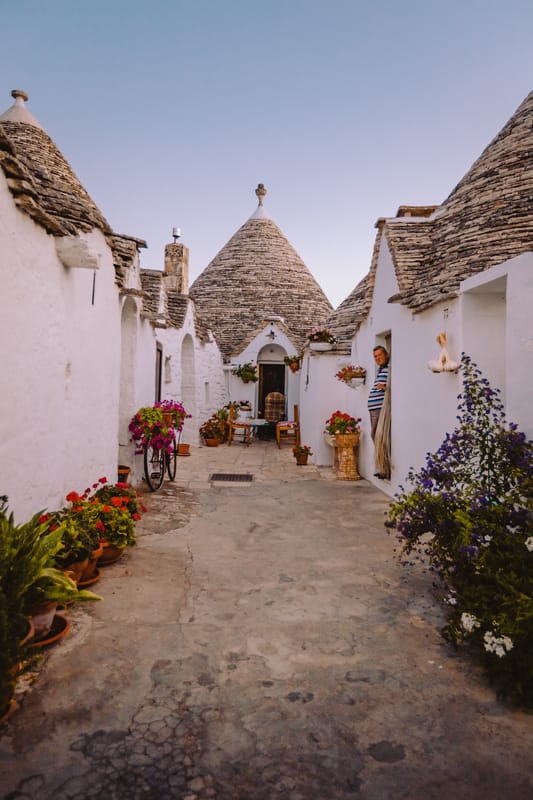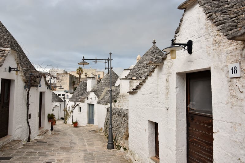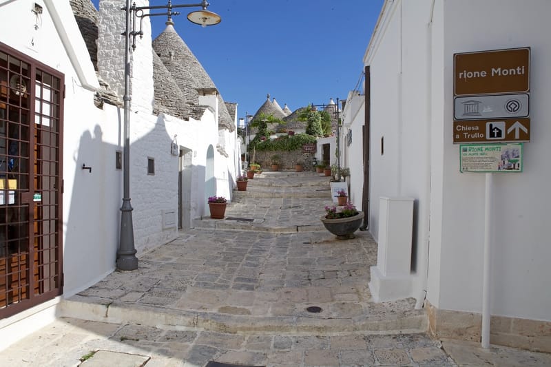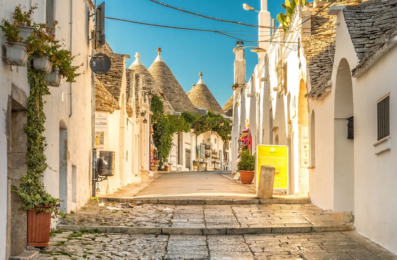 La aproximativ 60 km de Bari, intr-o vale cu livezi de maslini si mici casute din piatra ce apar printre acestia, se afla localitatea Alberobello. Poate cea mai celebra destinatie din Puglia, acest satuc pitoresc este inclus in patrimoniul UNESCO datorita cladirilor traditionale din piatra cunoscute ca trulli. Aceste trulli sunt o adevarata comoara culturala, cu un trecut inca incert si aspect fermecator. Construite din piatra si cu acoperisuri conice, aceste casute sunt cu adevarat magice. Poti ajunge aici cu trenul, existand mai multe curse zilnice ce au pretul de aproximativ 5 euro pe sens.