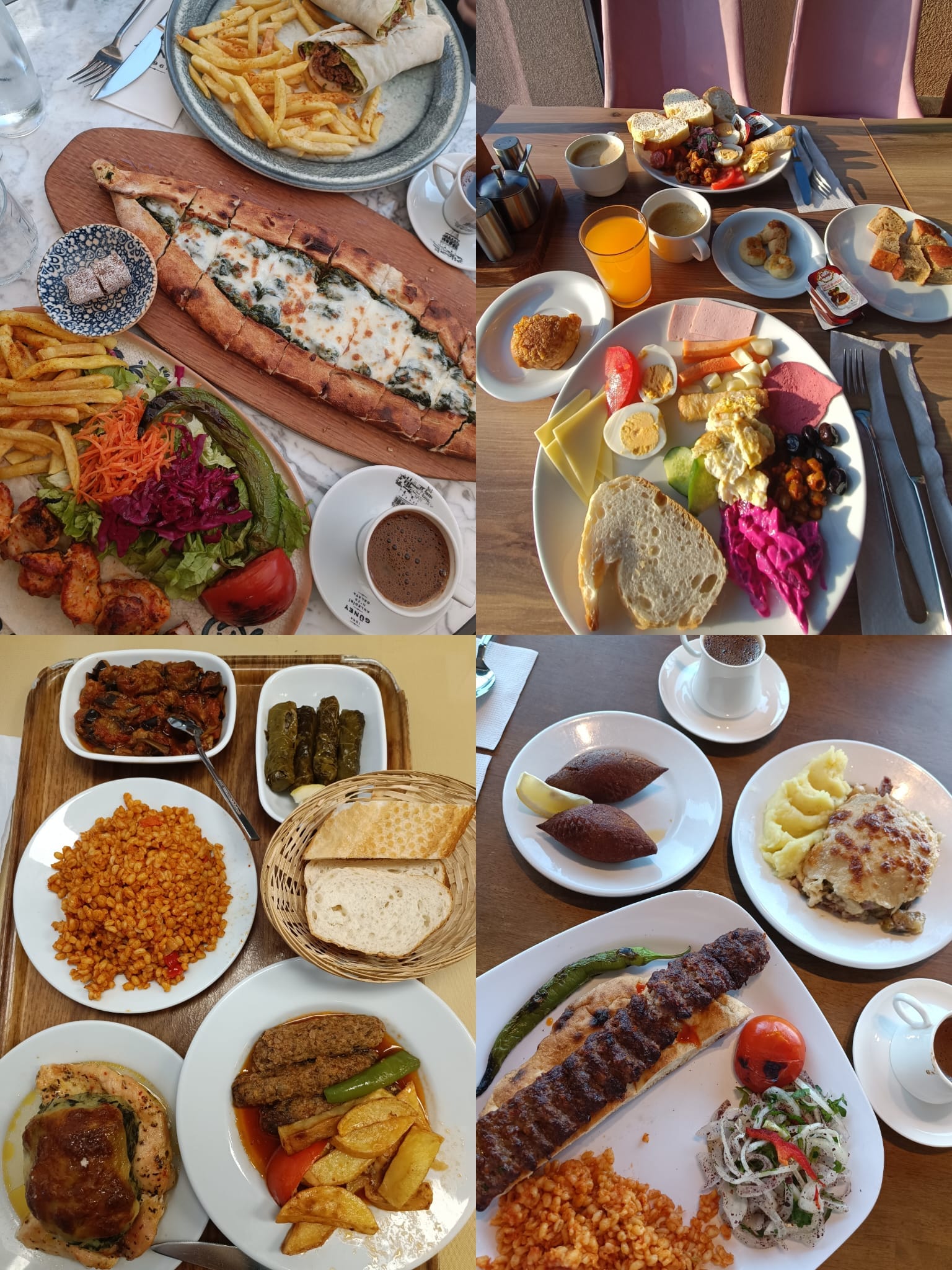 La masa de prânz, cele mai multe preparate sunt făcute din carne de pui și miel, iar garnitura este adesea linte, bulgur, couscous sau cartofi. Pe lângă toate acestea, vei avea mereu alături o salată cu roșii, castraveți, multă ceapă și pătrunjel. Tot din seria preparatelor turcești, îți recomand să testezi chiftele lor, numite Kofte, stropite cu puțină zeamă de lămâie…un adevărat deliciu culinar!