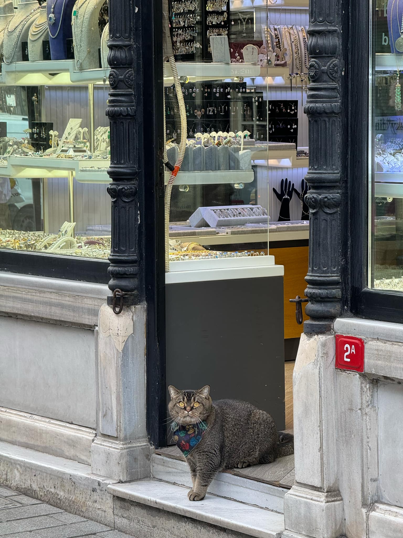 Fiind fană pisici m-am oprit cam des pentru a le mângâia sau admira. La un magazin de bijuterii, deja ne-am facut un prieten pe care îl vizităm an de an: de vreo trei ani încoace e la fel de frumos, blănos, elegant, doar își mai schimbă eșarfa cu un papion, și mai pășește din când în când pe la vecini pentru a admira niște instrumente muzicale. Ne-a rămas în suflet la prima vizită, și de atunci ori de câte ori ajungem în Istanbul mergem să vedem ce mai face prietenul nostru bijutier.