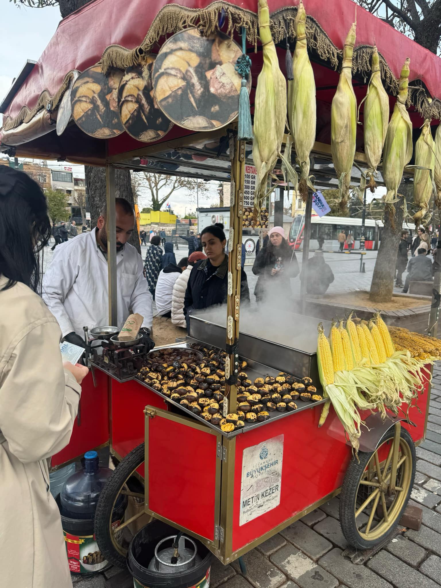 Lista continuă cu cafeaua turcească, castanele coapte, simitul sau variantele umplute cu cremă de brânză sau Nutella, porumbul indiferent că alegi varianta fiartă sau coaptă.