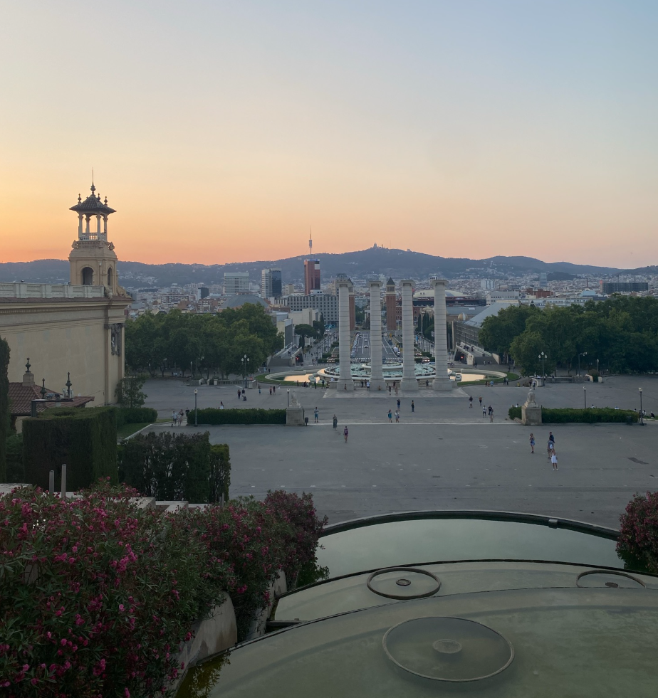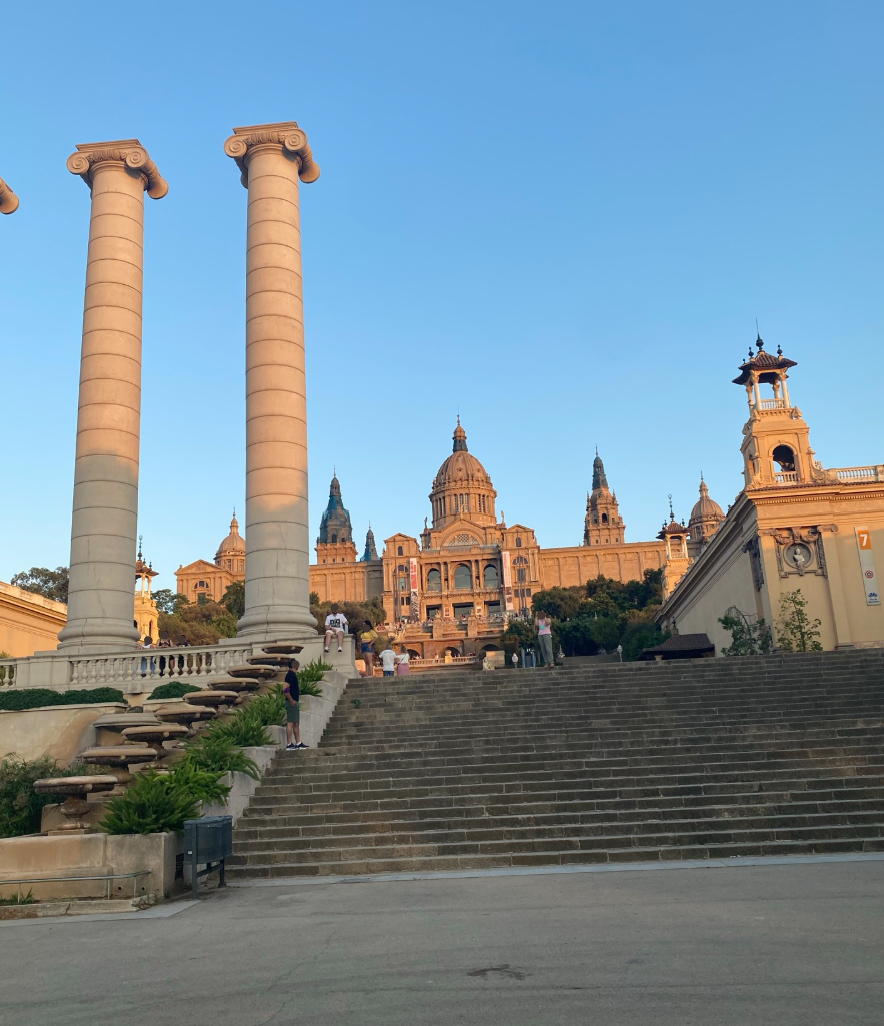 De aici am coborât spre El Poble-sec, un cartier autentic, cu străduțe înguste și o atmosferă locală foarte plăcută. Înainte de a ajunge în cartier, am prins apusul dintr-unul dintre cele mai spectaculoase locuri din Barcelona: zona Palau Nacional, cu scările monumentale, celebrele „Four Columns” și priveliștea superbă asupra Avinguda de la Reina Maria Cristina.