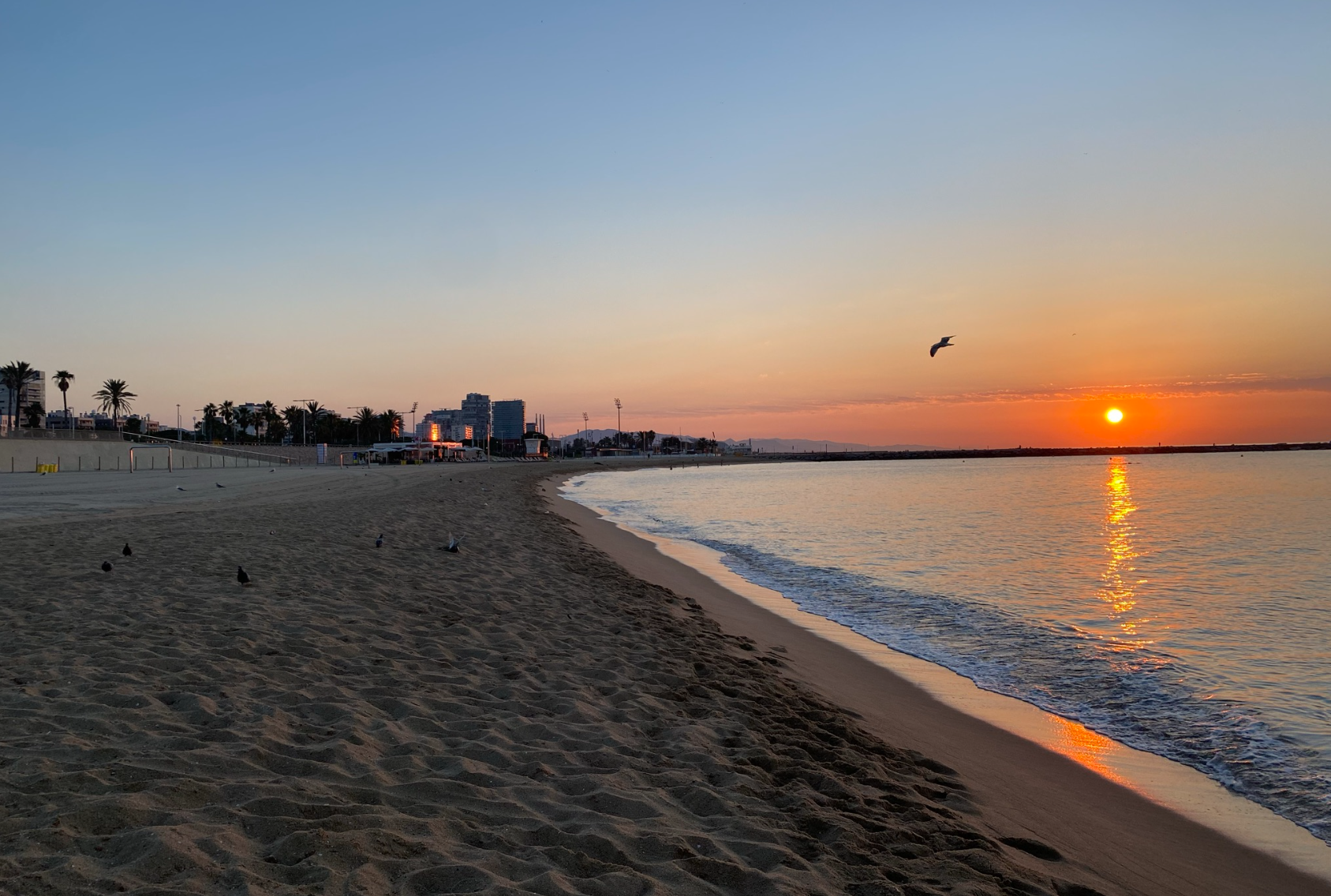 În ultima dimineață, înainte să plec spre aeroport, am mers pe plajă să văd răsăritul. Orașul era încă adormit, iar liniștea de pe malul mării mi-a dat un vibe foarte bun. Cerul a început să se coloreze treptat în nuanțe de portocaliu și auriu, iar valurile mici se loveau ușor de țărm, marcând foarte frumos încheierea vacanței.