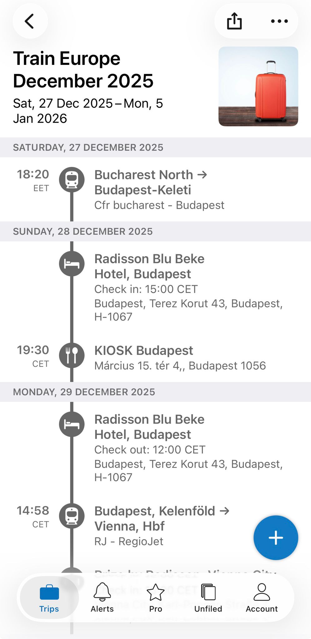 Noi folosim aplicația TripIt pentru organizarea rezervărilor. Aplicația are și o variantă gratuită, care este suficientă pentru planificare. Există opțiunea de a adăuga manual rezervările făcute (transport, hotel, restaurante, obiective turistice, etc.) sau dacă aveți o confirmare pe e-mail, puteți să dați forward și detaliile sunt importate direct în aplicație. Se pot salva și PDF-uri cu bilete sau rezervări, ceea ce ni se pare foarte util deoarece pot fi accesate ușor. Lăsăm mai jos un screenshot din aplicație, să vă faceți o idee cum organizează informațiile.