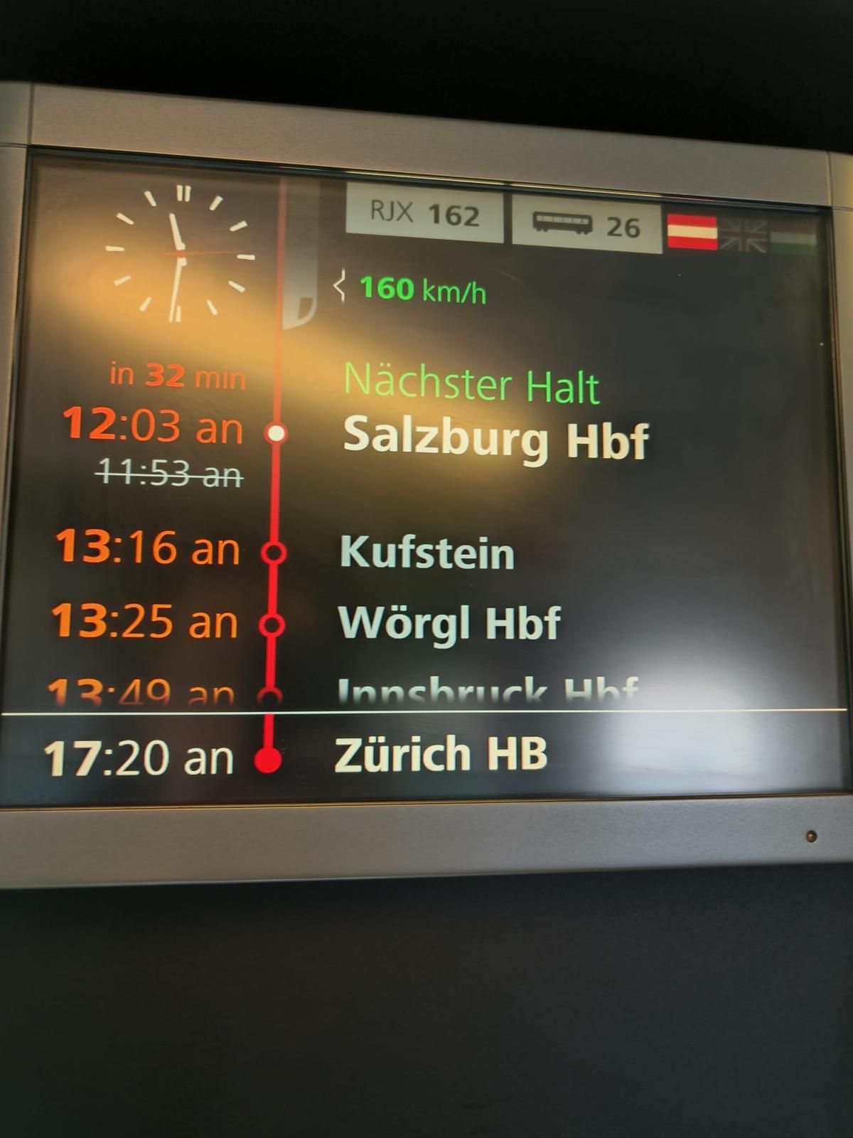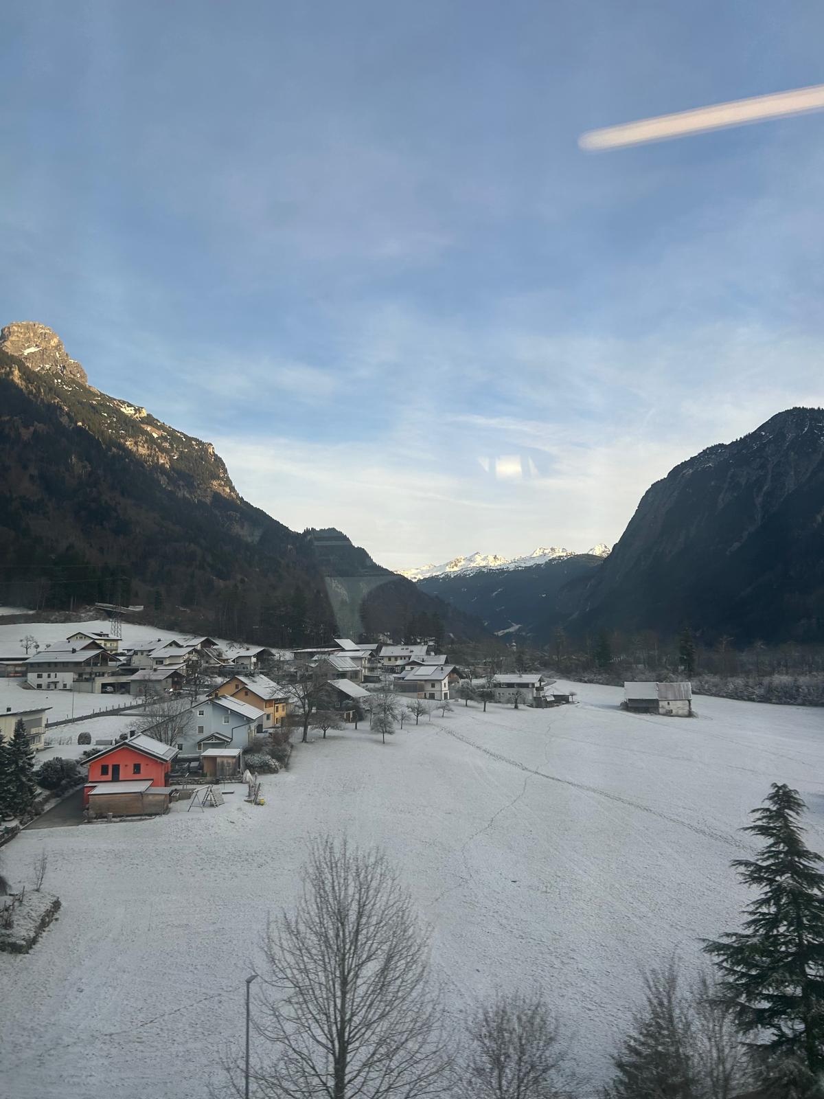 Aceasta a fost probabil una dintre cele mai obositoare zile din călătorie, am petrecut aproape 11 ore în tren. Cum povesteam și mai sus, planul inițial a fost să luăm un tren de noapte pe ruta Viena - Zurich, însă acesta nu a circulat pe 31 Decembrie. Așa că am plecat din Viena pe 1 ianuarie cu trenul RJX 162 la 9:28 și am ajuns în Zurich la 17:50, cu 30 minute întârziere față de ora programată. Biletele pentru acest tren le-am luat de pe site-ul OBB și au costat 200 EUR. Călătoria cu acest tren a fost obositoare în primul rând pentru că a fost lungă, dar și pentru că trenul era foarte aglomerat și oprea în foarte multe stații. Asta a însemnat că era tot timpul cineva în jur care se pregătea să coboare sau care își căuta locul. În plus, vagonul restaurant avea opțiuni extrem de limitate, din care lipsea până și cafeaua. Așa că toată ziua am băut doar apă și am mâncat din nucile pe care le aveam cu noi. Este recomandat să aveți întotdeauna ceva de mâncare în bagaj, întrucât uneori e imprevizibil ce puteți cumpăra din tren. Ca o concluzie, recomandarea noastră este să luați trenul de noapte pe această rută, cu siguranță timpul trece mai repede și este mai liniște.