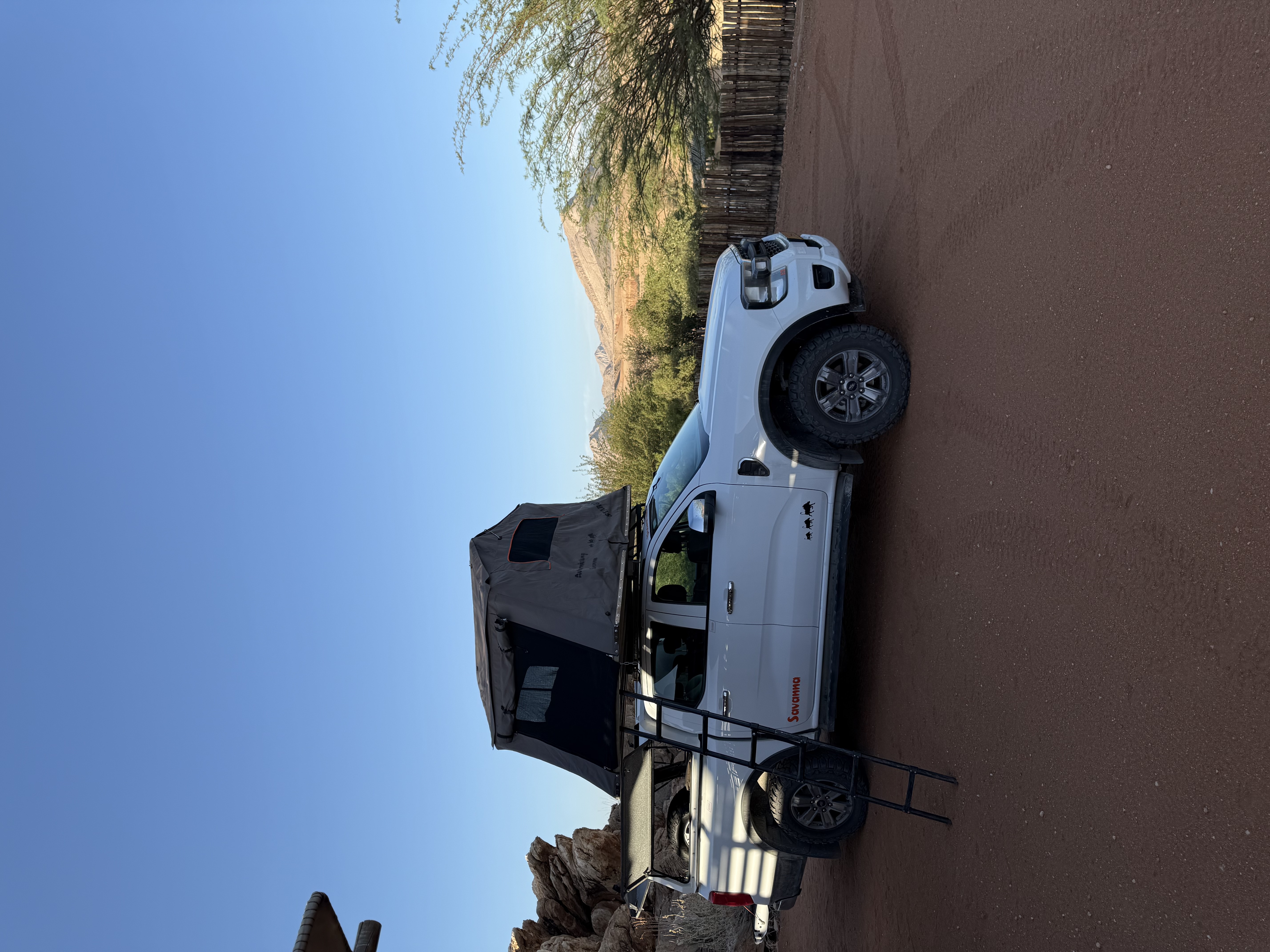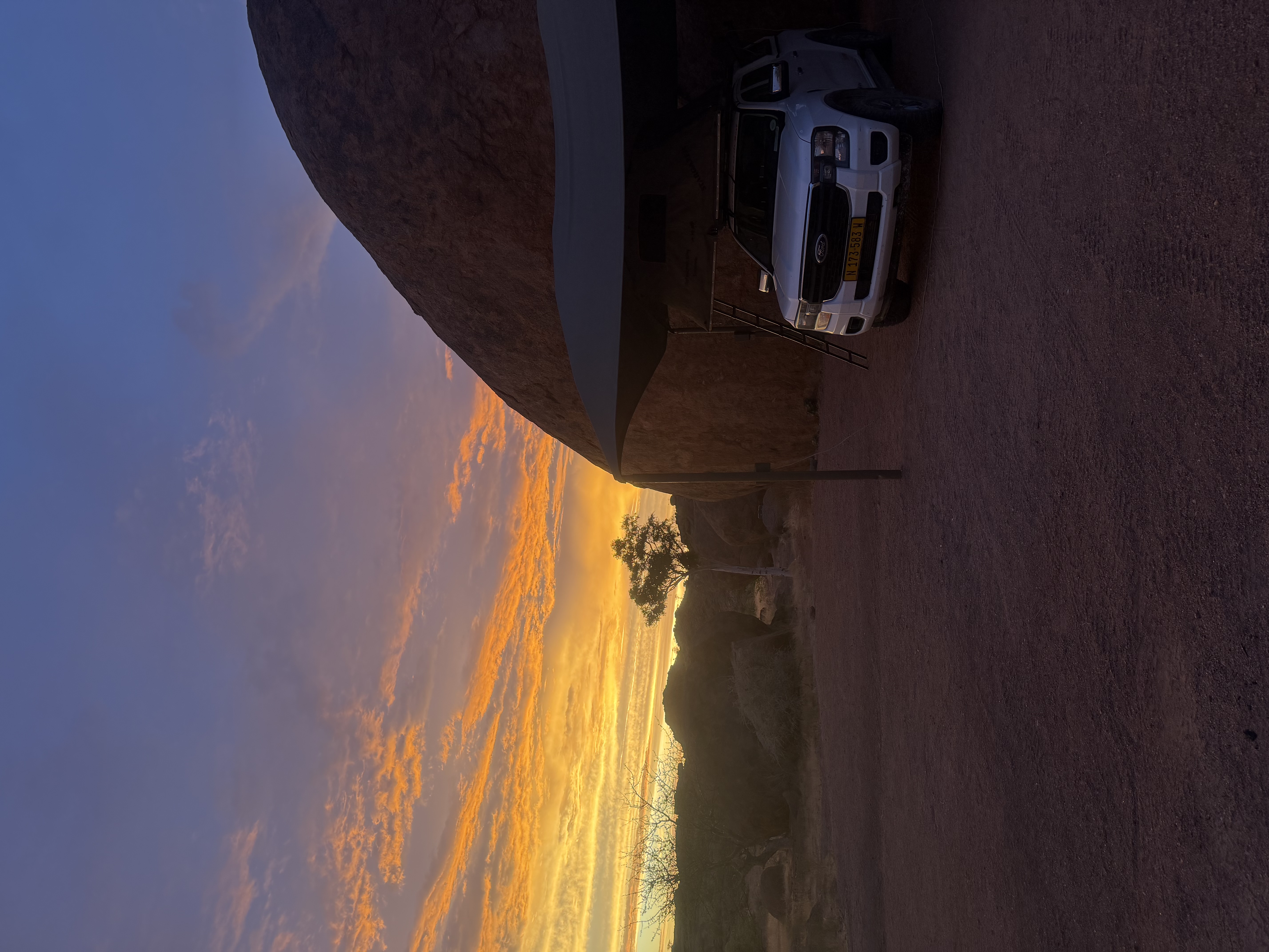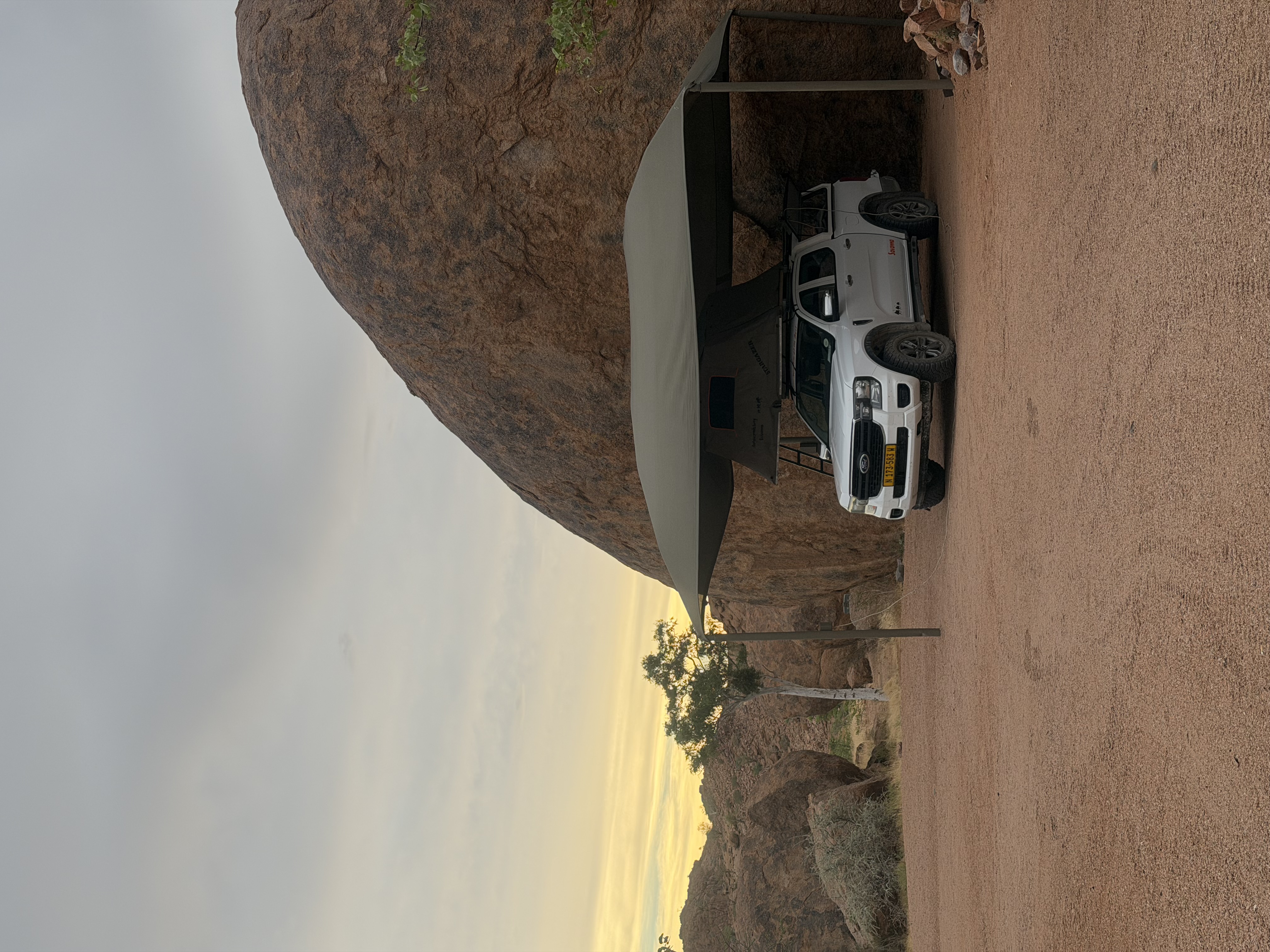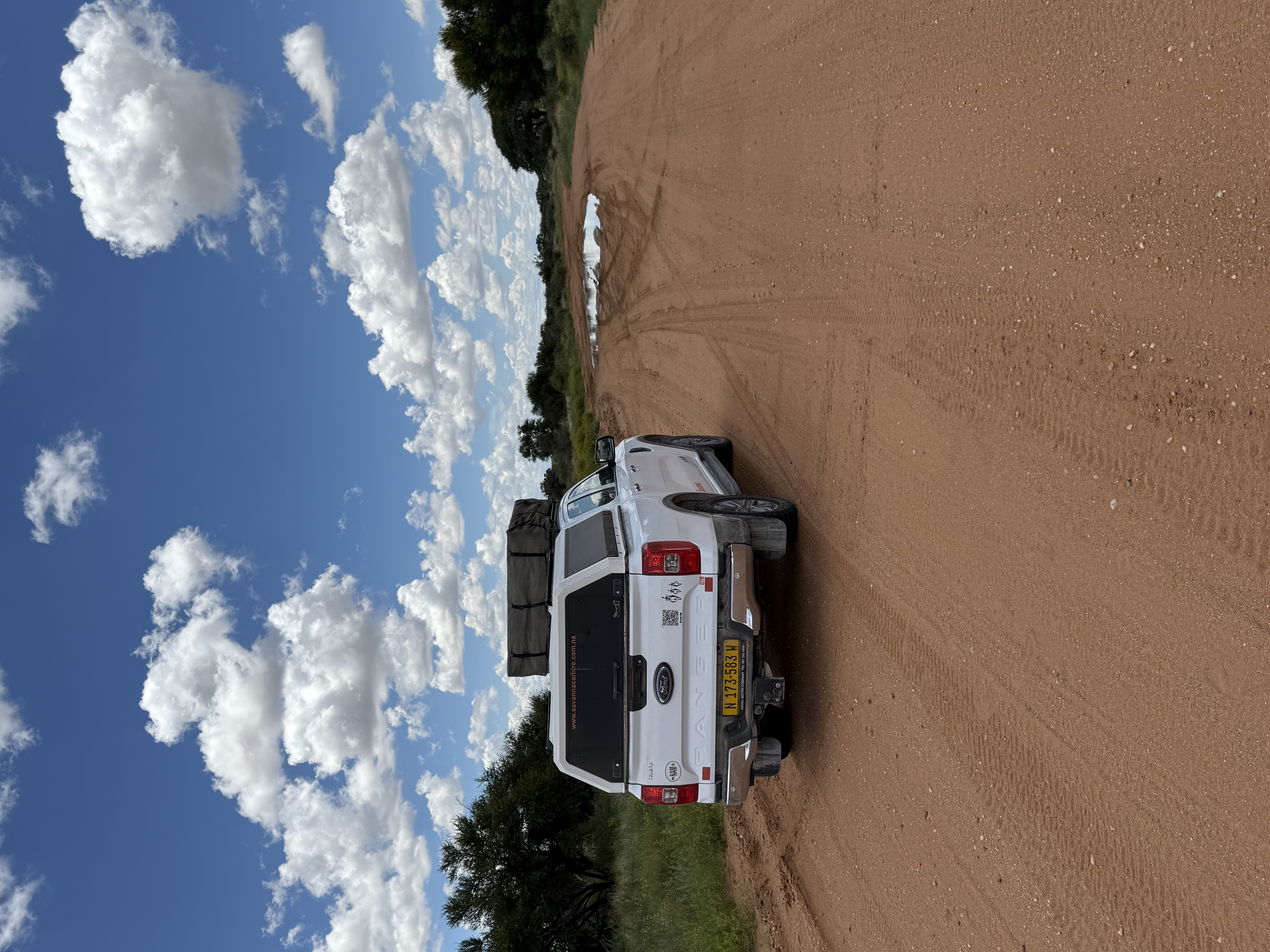 Pentru a ne deplasa noi am optat pentru o mașină 4x4, un Ford Ranger, cu cort pe plafon. Noi am ales să închiriem de la Savanna Car, pe care îi recomand. Experiența avută cu ei a fost una foarte bună, și poți alege să nu lași garanție dacă optezi pentru asigurările extra. Costul mașinii ne-a ajuns undeva la 100 de euro pe zi, cu toate asigurările posibile. De ce e bine să le ai? Asta am aflat în ultima zi când după 2500 km parcurși fără incidente, la 30 de km de capitală ne-a sărit o pietricică de la mașina ce trecea pe sensul opus și a ciobit parbrizul. Această daună e la ei acoperită doar de o asigurare extra. La fel și în cazul cauciucurilor, penele sunt ceva destul de frecvent, așa că primești de la ei două rezerve. Noi am scăpat fără, dar probabil am avut noroc. Ce e bine de știut, chiar și cu asigurări extra, tot nu ai acoperire pentru accidentele cu animale, sau cele în care e doar mașina ta implicată. Preluarea mașinii e și ea o experiență în sine, durând cam o oră jumătate, timp în care primești informațiile necesare, legate de cort, mașină, numere de urgență și multe altele. Obosiți de la zbor și zăpăciți de multitudinea de informații am pornit la drum. În Namibia se conduce pe partea "greșită" a drumului…deci să incepem acomodarea!