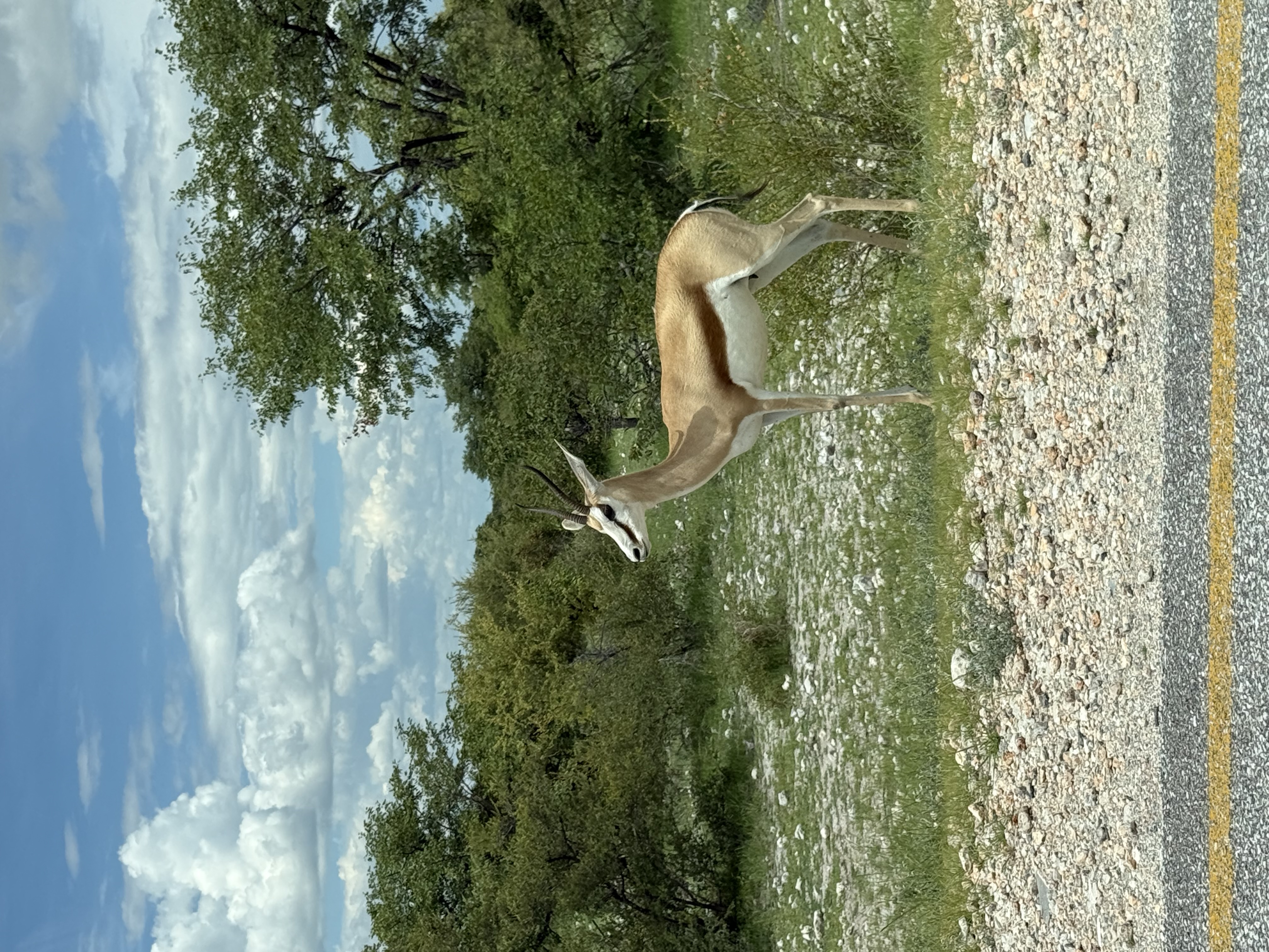 Zis și făcut... dis de dimineață am pornit la drum din Windhoek. Navigația ne indica aproximativ 450 km, iar ca timp 4 ore jumătate. Drumul a fost asfaltat, cu limită de viteză de 120 km pe oră, traversând zone verzi, presărate cu mușuroaie uriașe de termite. Ceea ce era ciudat, deși drumul era în stare perfectă, traficul lipsea, abia am întâlnit câteva mașini venind din sens opus. Până la poarta de intrare în parc am văzut doar doua - trei sate, și am traversat un mic orășel, în rest am străbătut prin natură sălbatică.