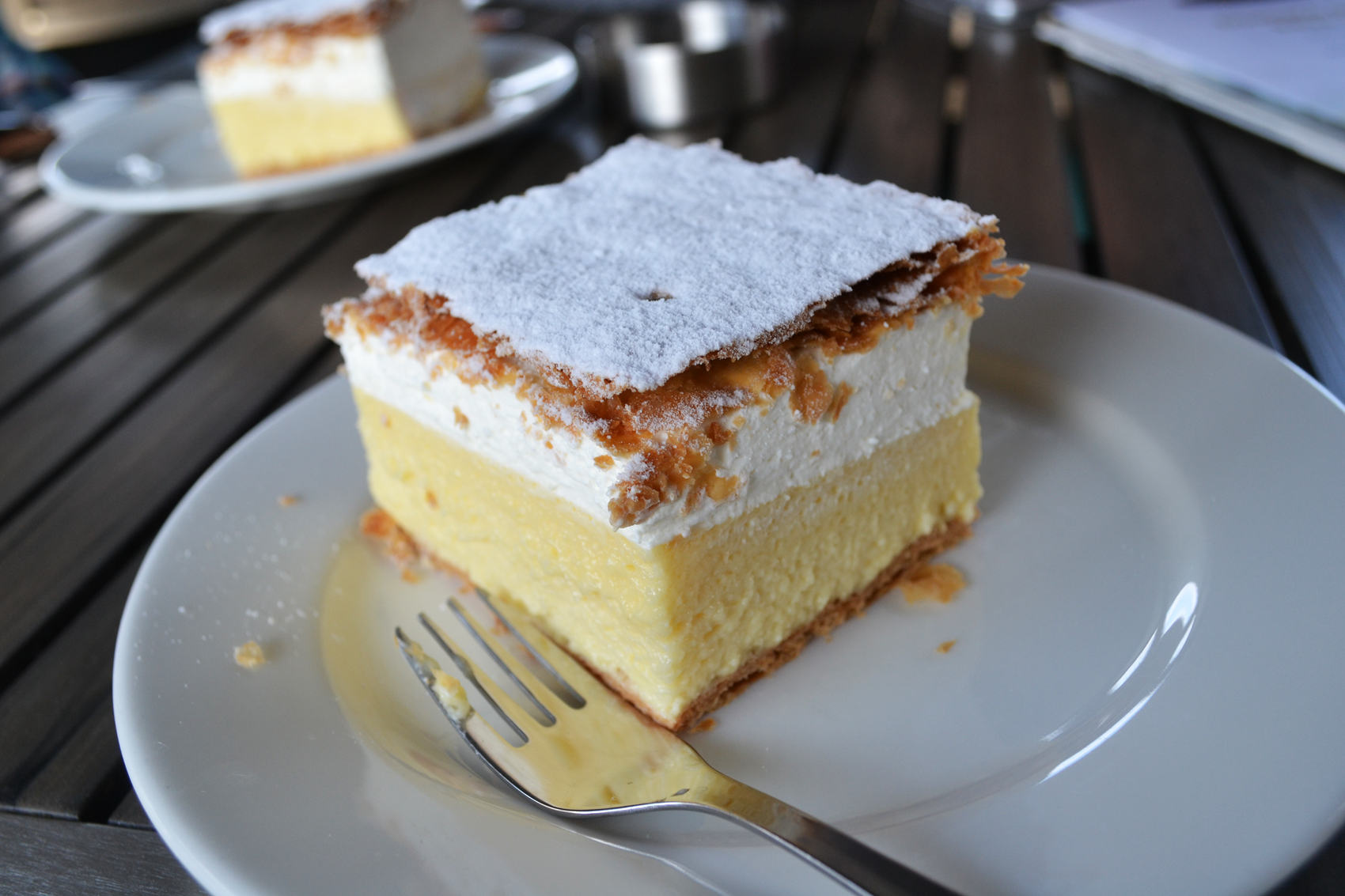 La Bled am încercat faimosul Bled cream cake (kremna rezina), un desert fin, cu cremă de vanilie și frișcă, absolut delicios.