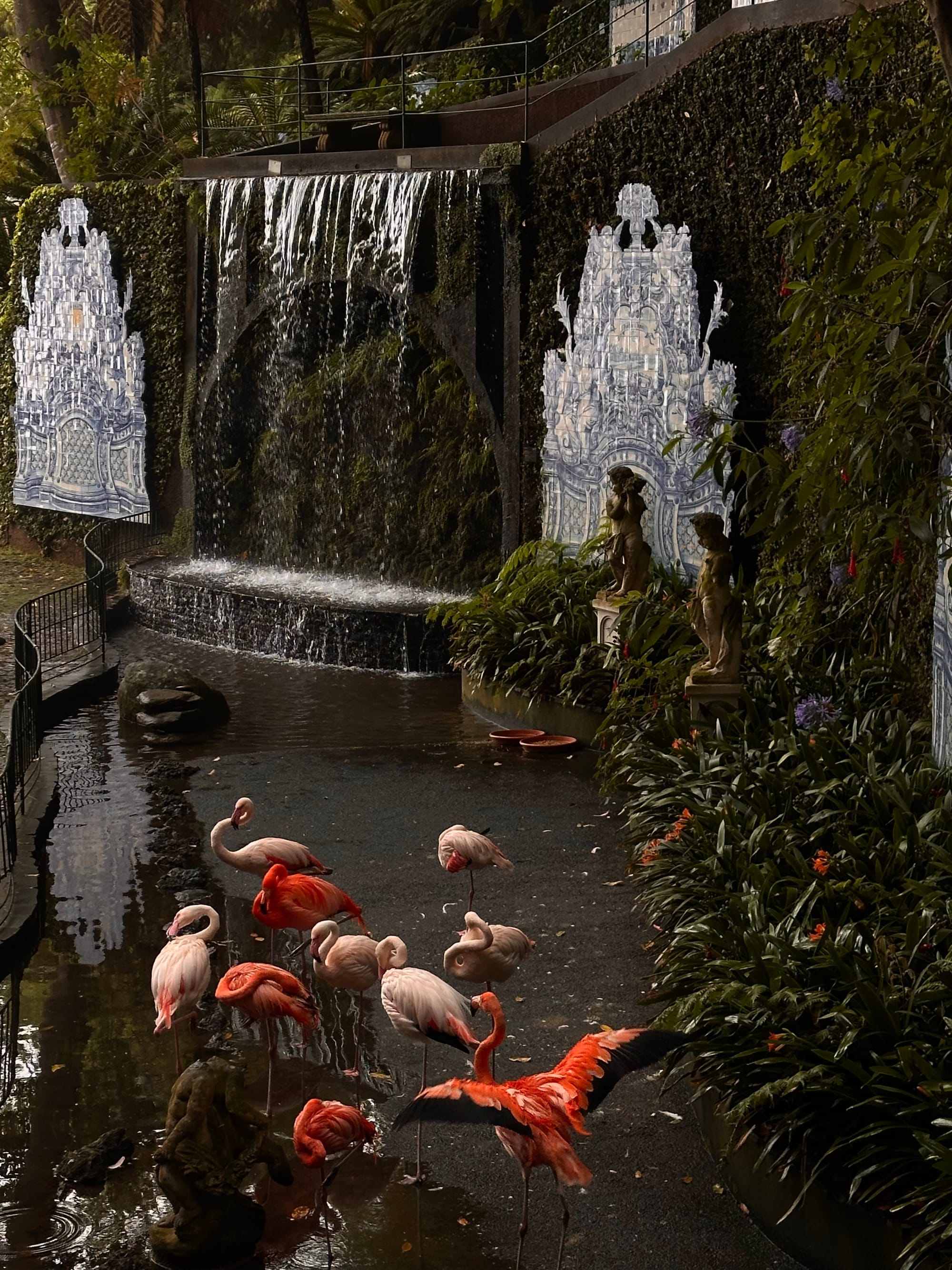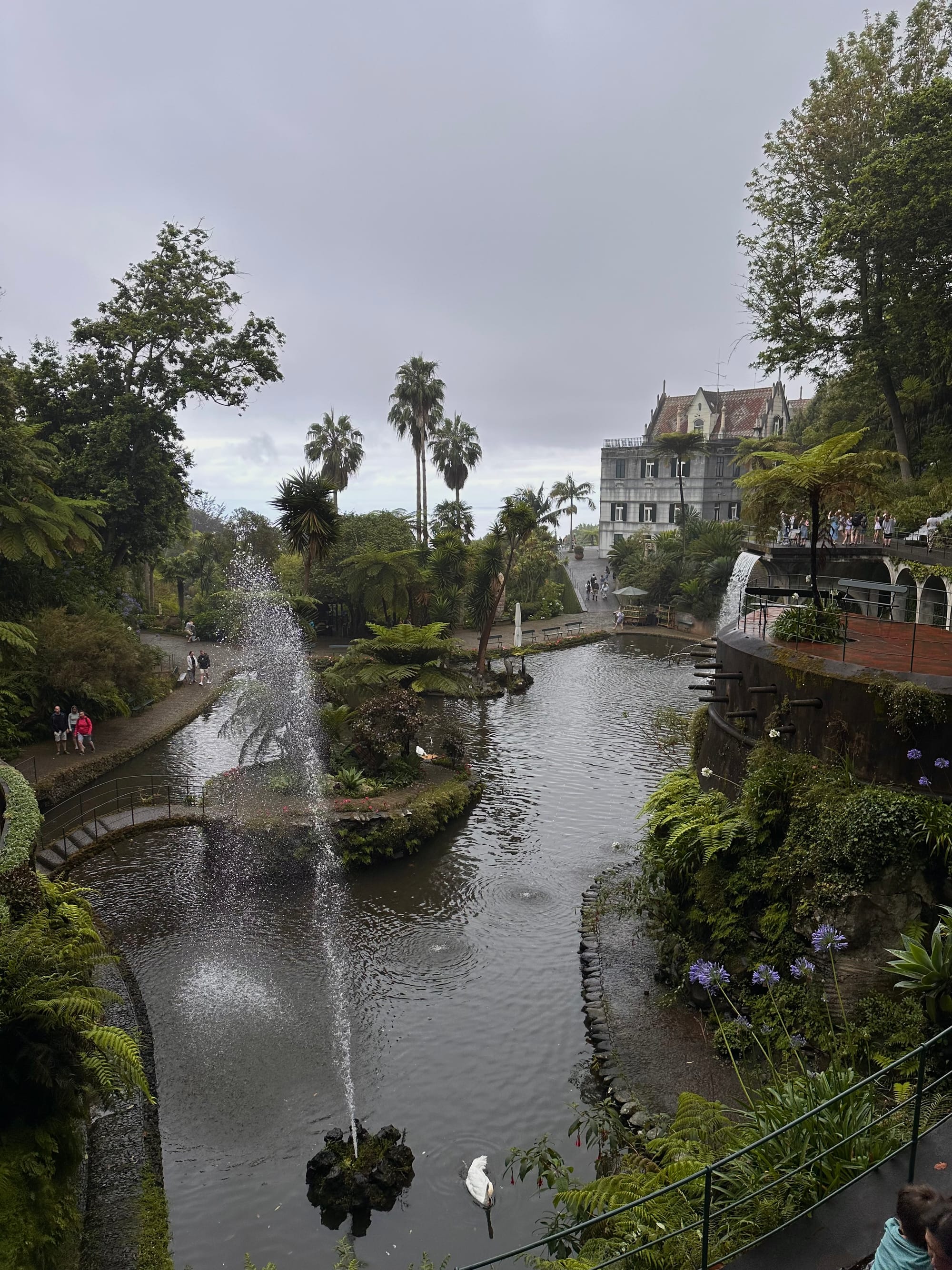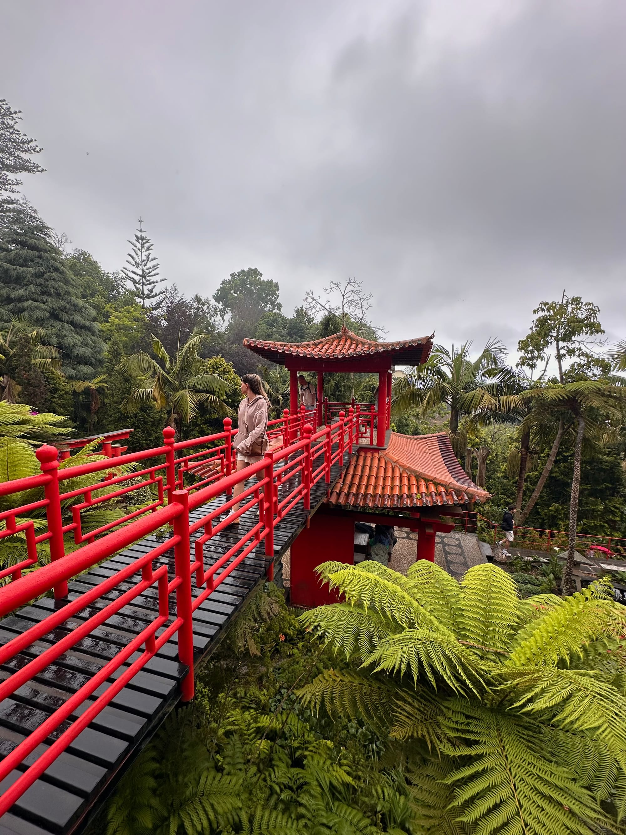 Sus, am intrat în Monte Palace Tropical Garden, și, sincer, am fost luată prin surprindere. Nu mă așteptam la un loc atât de mare și poetic. Grădina e un labirint verde cu lacuri, flori exotice, bambus, statui japoneze, păuni și alei tăcute care te fac să uiți că ești la doar 15 minute de un oraș capitală.