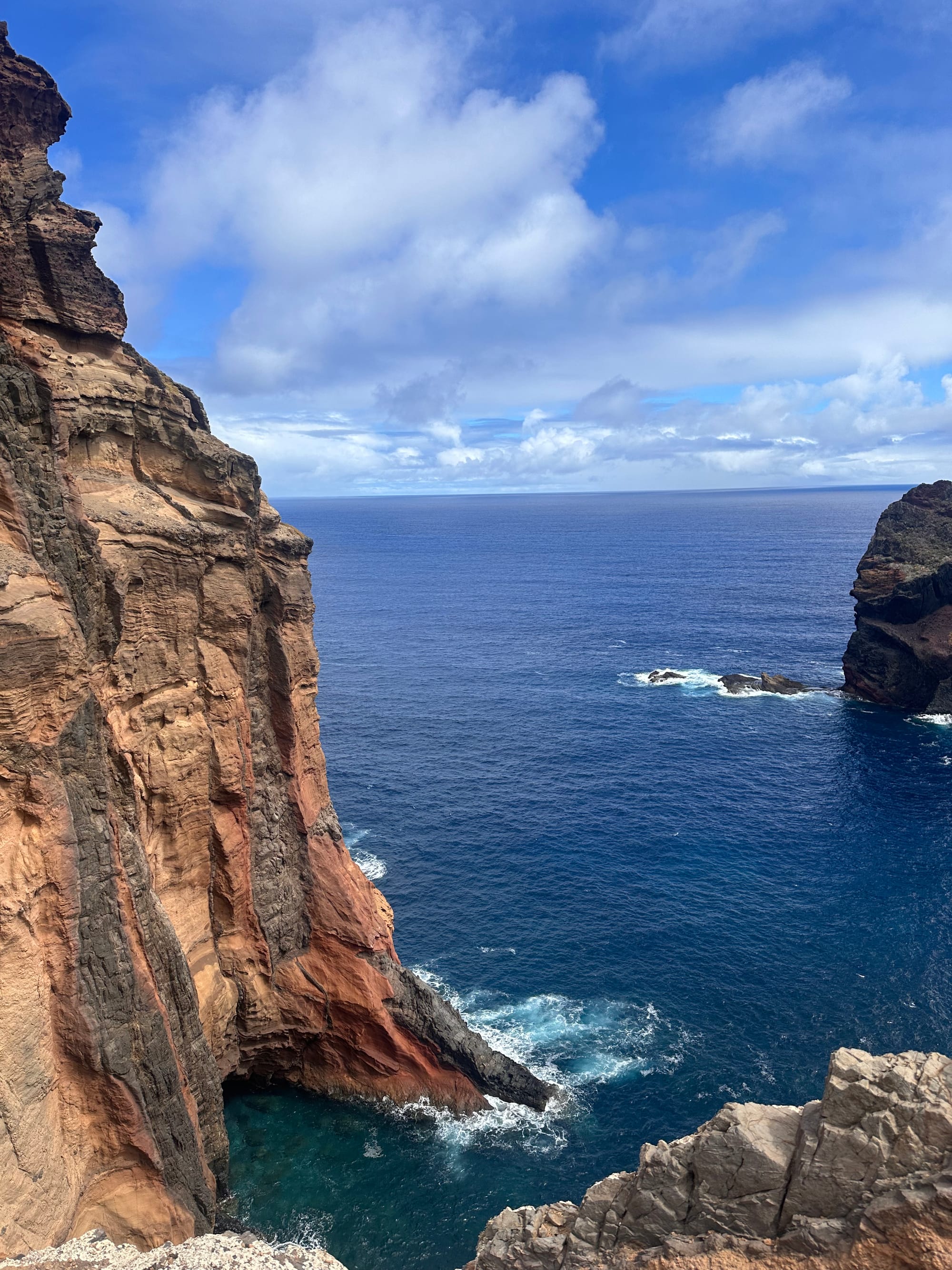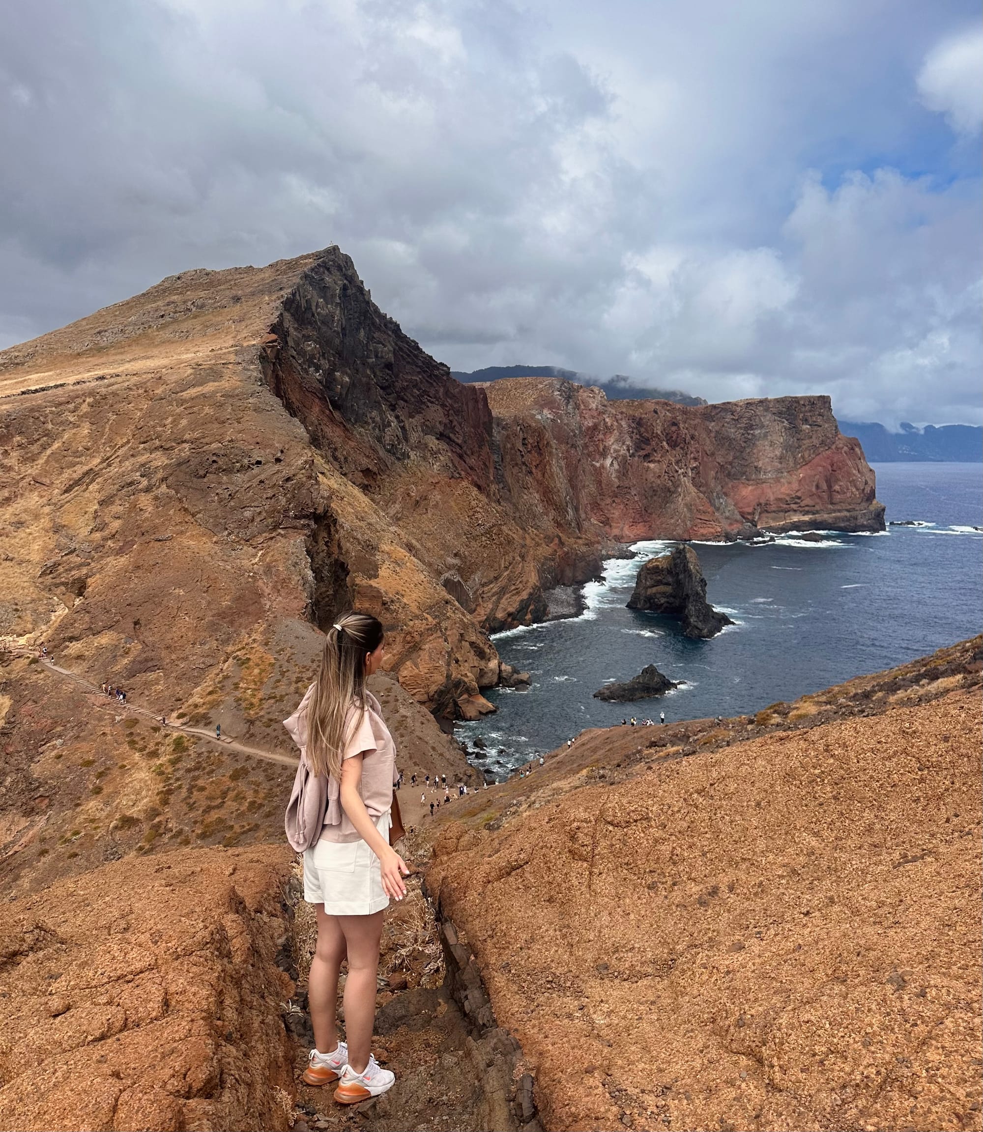 Aici, Madeira nu mai e verde. Devine roșie, uscată, sălbatică. Dealurile sunt golașe, vântul bate constant, iar oceanul se lovește cu forță de pereții abrupți ai coastei. În stânga și în dreapta, vezi doar apă – e ca și cum ai merge pe o coloană vertebrală stâncoasă a insulei, până la ultimul punct locuibil.