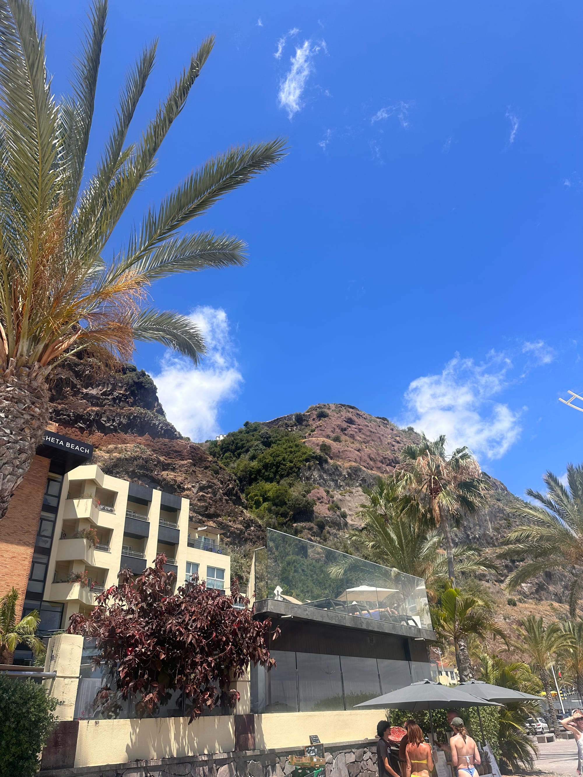 Am pornit din Funchal pe la 9 dimineața, cu direcția Calheta, un mic orășel de coastă unde se află una dintre puținele plaje cu nisip galben din Madeira. Nisipul nu e local, a fost adus din Sahara, dar experiența e autentică: palmieri, apă limpede și caldă, și un vibe de stațiune mică, fără agitație.