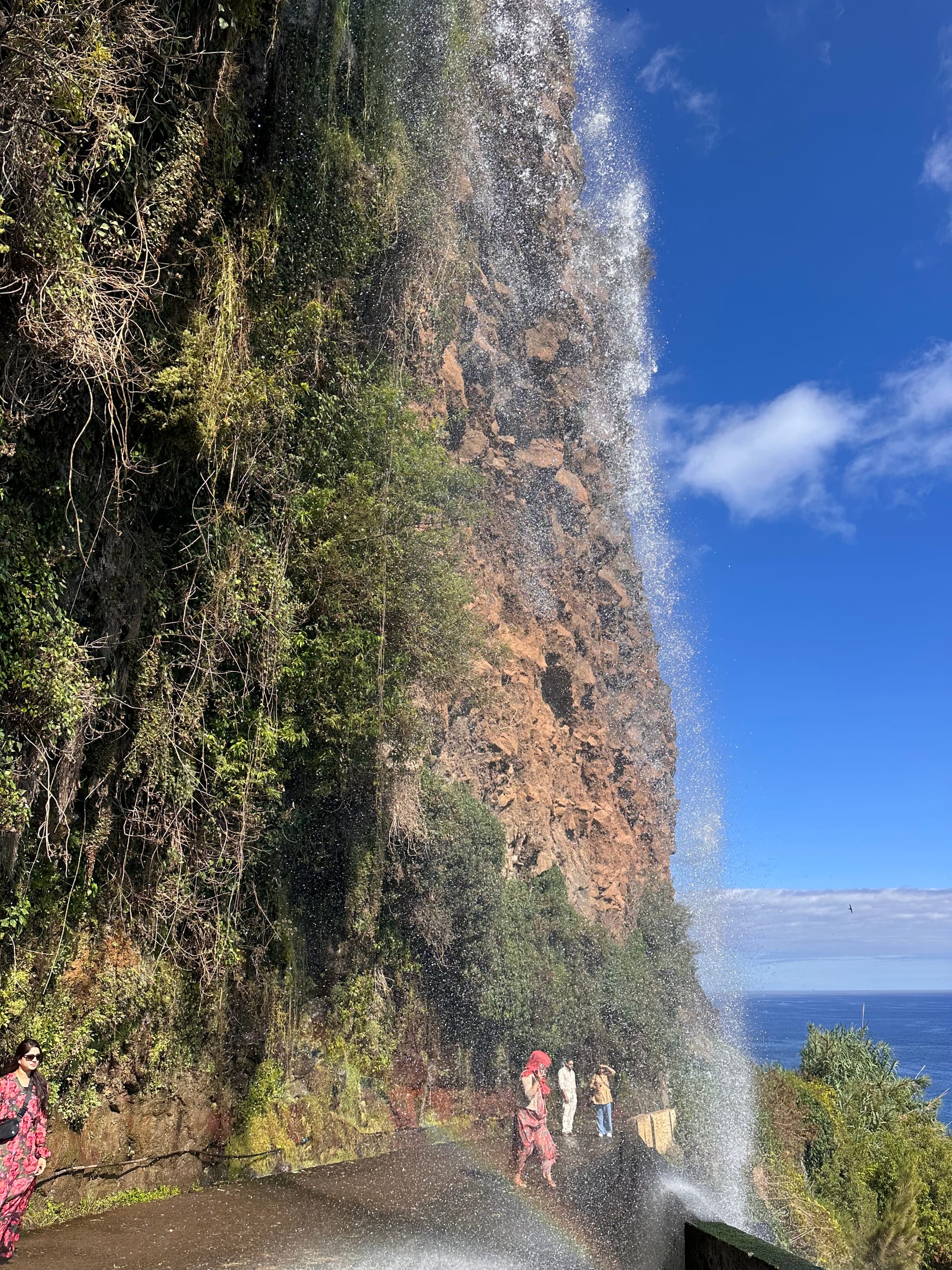 Pe drum din Calheta spre Ponta do Sol, am făcut o oprire la Cascada dos Anjos, cunoscută și drept „cascada de pe șosea”. Imaginează-ți un drum îngust, pe marginea stâncii, cu un firicel de trafic și brusc... o cascadă care curge direct peste asfalt.